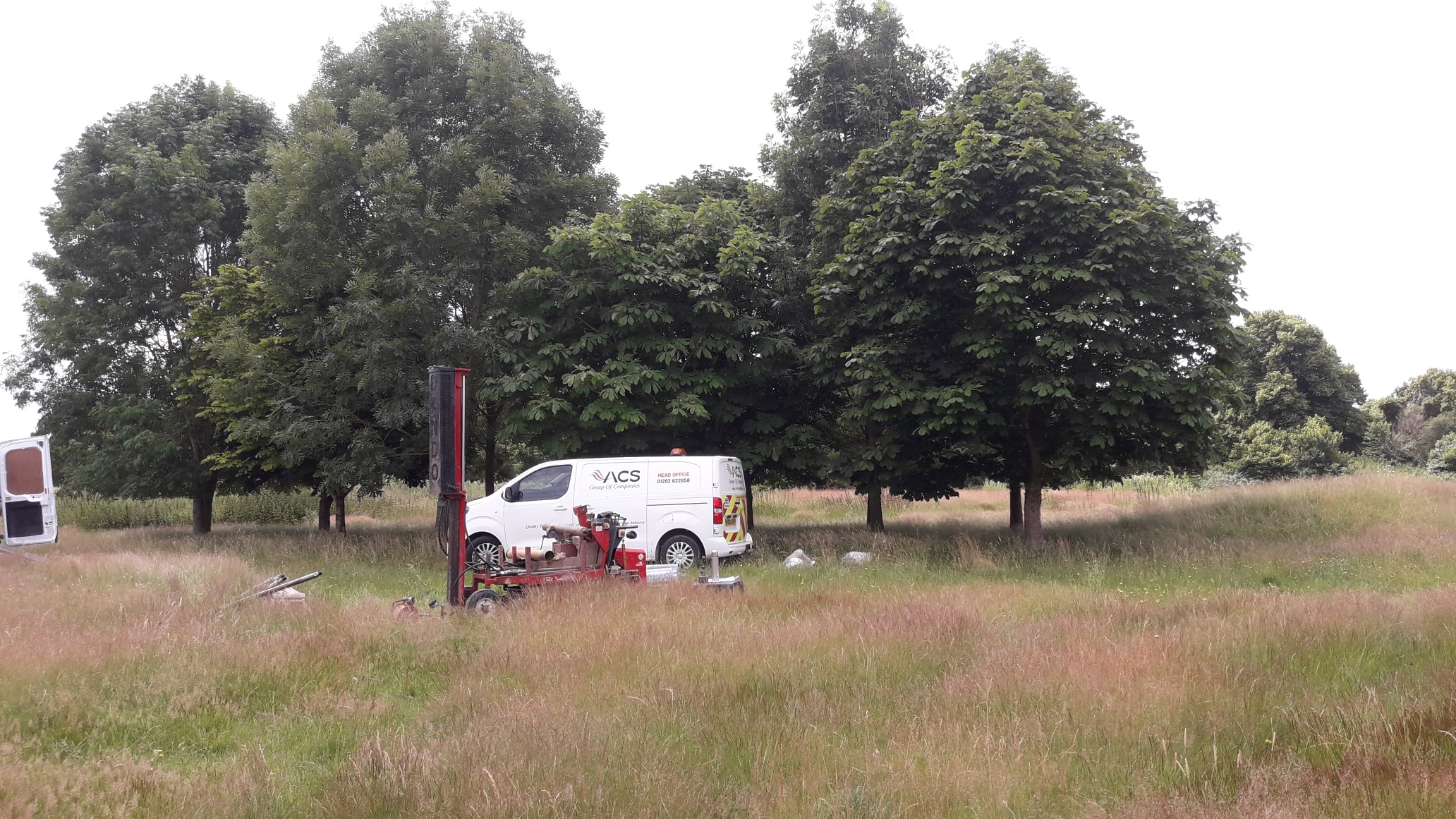 Cable percussion drilling requires a more open site with access for a 4x4 vehicle, this vehicle is used to tow the rig and carry extra equipment. Cable drilling requires an area of approximately 5x5m to enable the setup of the rig and safe working.